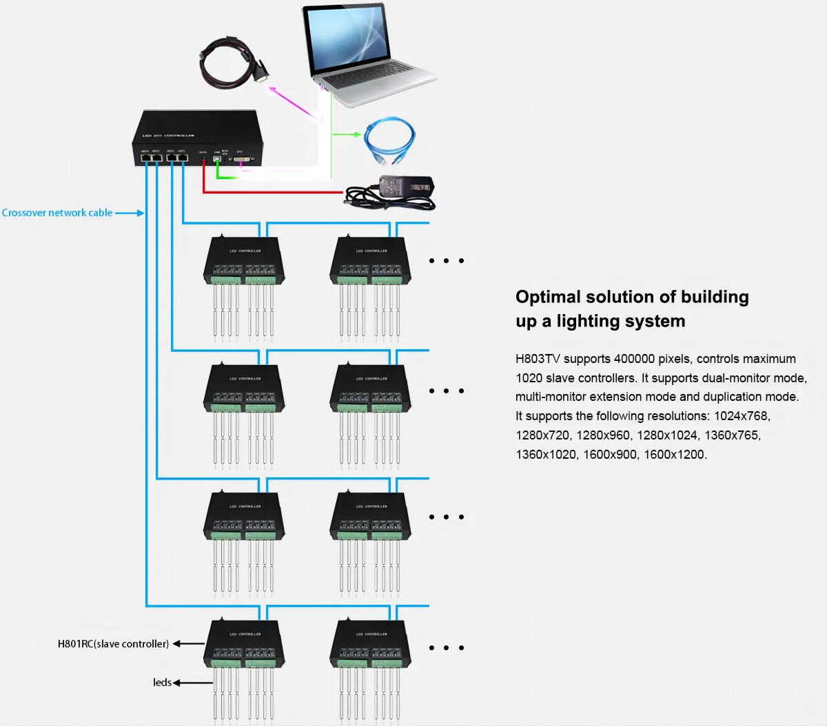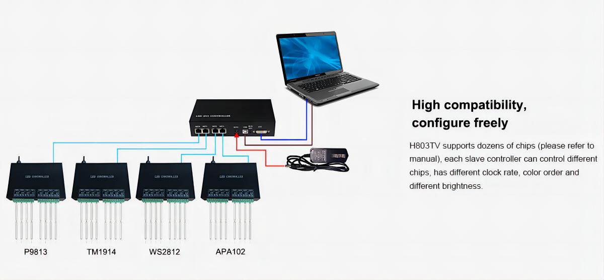 - Four network ports are independently configured to control fixtures with different chips, each network port can connect up to 255 sub-controls, and each H803TV can connect up to 1020 sub-controls.