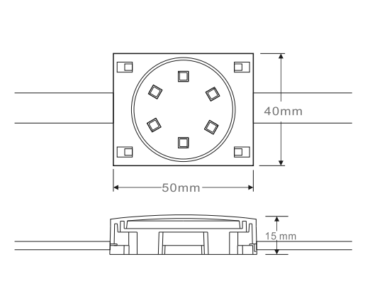 LED Pixel Light RGB 6LEDs 50MM is made by ABS plastic shell, PC LENs and PCB and red, yellow, green, blue and white 5PIN line (high temperature resistant, cold resistant, UV resistant). this product has high brightness, low power consumption, long life, low voltage, small attenuation, rich colors, etc. Products can achieve effect of flowing water, chase, scanning, etc. Depending on the installation, but it was a composition change different color characters, design, etc. Various kinds of dynamic effect.